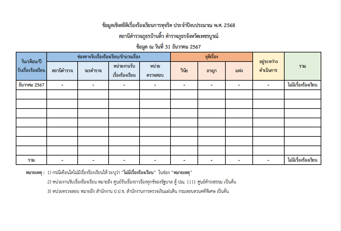ข้อมูลเชิงสถิติเรื่องร้องเรียนการทุจริต ประจำเดือน ธันวาคม 2567