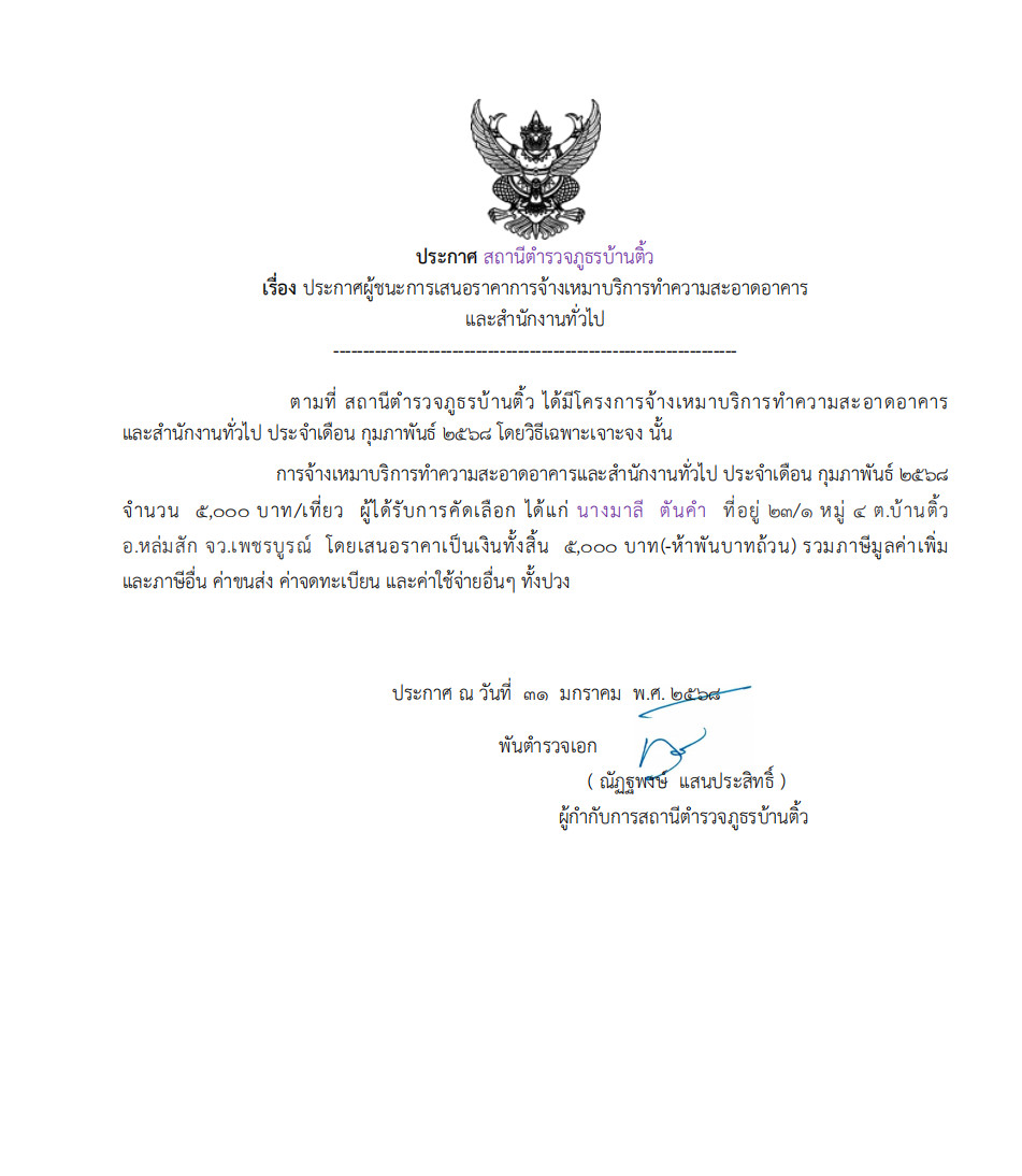 ประกาศ จ้างเหมาทำความสะอาด ประจำเดือน กุมภาพันธ์ 2568