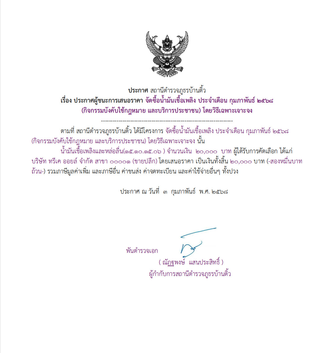 Download เอกสาร ประกาศจัดซื้อน้ำมันเชื้อเพลิง เดือน กุมภาพันธ์ 2568 ประจำปีงบประมาณ พ.ศ.2568