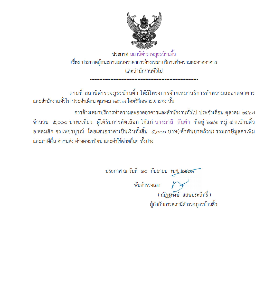 ประกาศ จ้างเหมาทำความสะอาด ประจำเดือน ตุลาคม 2567