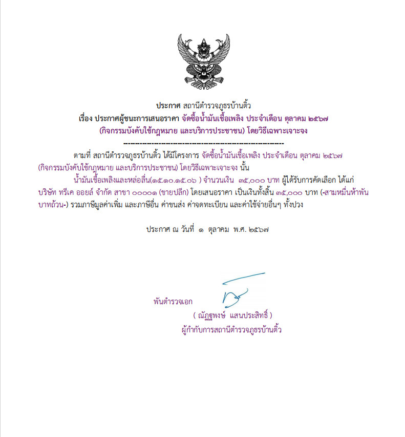ประกาศ จัดซื้อน้ำมันเชื้อเพลิง ประจำเดือน ตุลาคม 2567