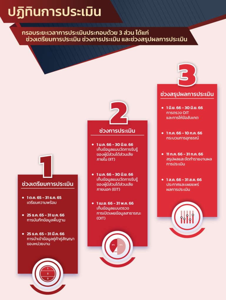 – การกำหนดมาตรการ/กิจกรรม ในการเตรียมความพร้อมรับการประเมิน ทั้งด้านระบบงาน พฤติกรรมและวัฒนธรรมของผู้ปฏิบัติงาน การสื่อสารสร้างการรับรู้ต่อผู้มีส่วนได้ส่วนเสียภายใน (IIT) และผู้มีส่วนได้ส่วนเสียภายนอก (EIT)