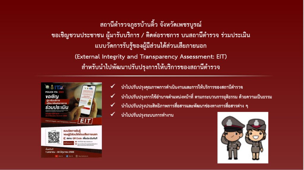 เมื่อวันที่ 15 มีนาคม 2566 พ.ต.อ.เกรียงไกร รินทพล ผกก.สภ.บ้านติ้ว ประชาสัมพันธ์เชิญชวนคณะกรรมการ กต.ตร.สภ.บ้านติ้ว ร่วมทำแบบประเมิน ผู้มีส่วนได้ส่วนเสียภายนอก (EIT)
