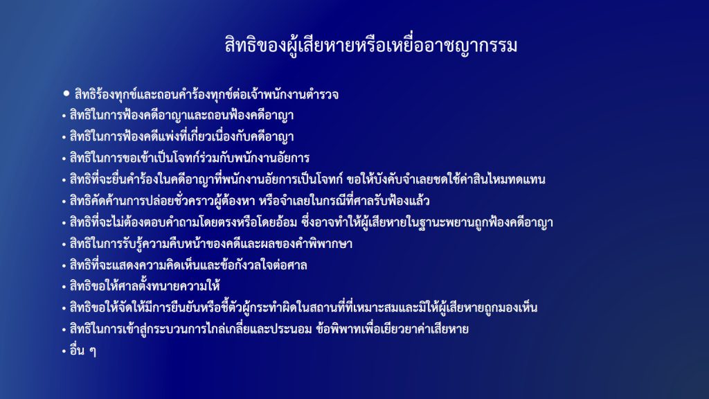 Download เอกสาร สิทธิของผู้เสียหายหรือเหยื่ออาชญากรรมและสิทธิของผู้ต้องหา